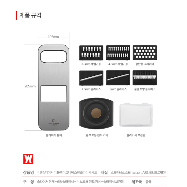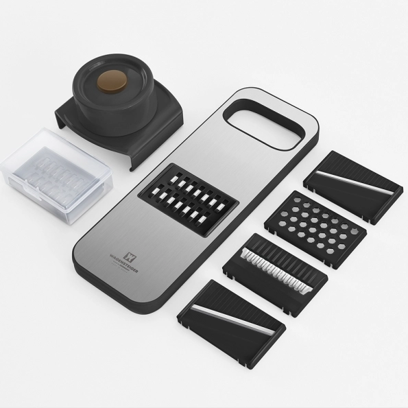 1. Various Components: SUS 304 slicer body, 6 types of multi slicer, hand cover for protection, slicer storage box.