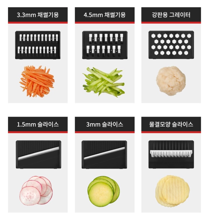 6. The 6 types of multi slicer can easily and quickly slice and julienne tough ingredients like potatoes, carrots, cucumbers, garlic, and ginger.