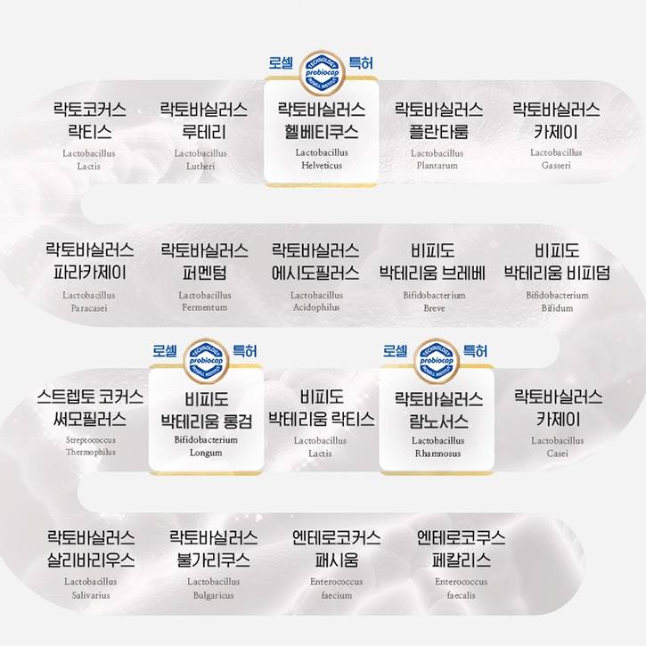 Selenium-containing dried yeast, zinc oxide, B.animalis ssp. lactis, 19 types of mixed lactic acid bacteria powder (Lc.lactis, S.thermophilus, E.faecium, L.plantarum, L.rhamnosus, L.acidophilus, L.reuteri, B.bifidum, B.longum, L.helveticus, L.fermentum, L.paracasei, B.animalis ssp. lactis, L.salivarius, B.breve, L.gasseri, L.delbrueckii ssp. bulgaricus, L.casei, E.faecalis, maltodextrin), L.plantarum LB931, L.plantarum K8, L.plantarum CLP0611, fructooligosaccharide powder, isomalt, galactooligosaccharide, non-digestible maltodextrin, wheat dietary fiber, acacia dietary fiber, xylooligosaccharide powder, chicory dietary fiber, milk calcium, vitamin C, magnesium stearate, silica, Bacillus coagulans, multivitamin mix, plant-based lactic acid bacteria inactivated/kapsule medium: hydroxypropyl methylcellulose.