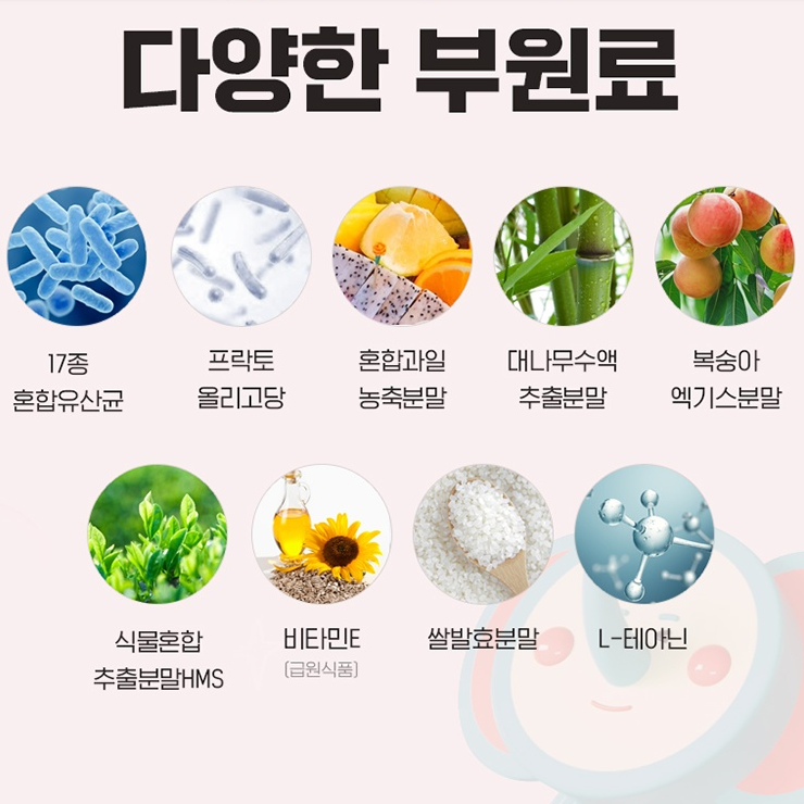 Ferrous pyrophosphate mixture [ferrous pyrophosphate, corn starch, sunflower lecithin], vitamin C, vitamin B12 mixture [vitamin B12, maltodextrin, sodium citrate, citric acid], folic acid, anhydrous crystalline glucose, peach flavor powder [fructose, glucose, dextrin, mixture [dextrin, propylene glycol, synthetic flavoring, ethanol, gum arabic, purified water, glacial acetic acid], peach extract powder, citric acid, silicon dioxide, refined salt, steviol glycosides (sweetener)], isomalt (sweetener), erythritol (sweetener), mixture [dextrin, propylene glycol, synthetic flavoring, ethanol, gum arabic, purified water, glacial acetic acid], DL-malic acid, enzyme-treated stevia (sweetener), bamboo sap extract powder, anhydrous citric acid, gum arabic, mixed fruit concentrate powder, plant mixed extract powder HMS, fructooligosaccharides, 17 types of mixed lactic acid bacteria, vitamin E mixture [dl-α-tocopheryl acetate, modified starch, glucose syrup powder, silicon dioxide], L-theanine, rice fermentation powder.