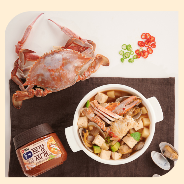 56% fermented soybean paste [soybeans (imported), sea salt (from Australia), starter culture], 14% soybean paste [soybeans (imported), sea salt (from Australia), starter culture], purified water, minced garlic (from China), concentrated flower crab extract (flower crab: domestic), soybeans, minced onion, alcohol, seafood seasoning A, refined salt, dried pollack extract, red pepper powder, concentrated shellfish extract, licorice extract.