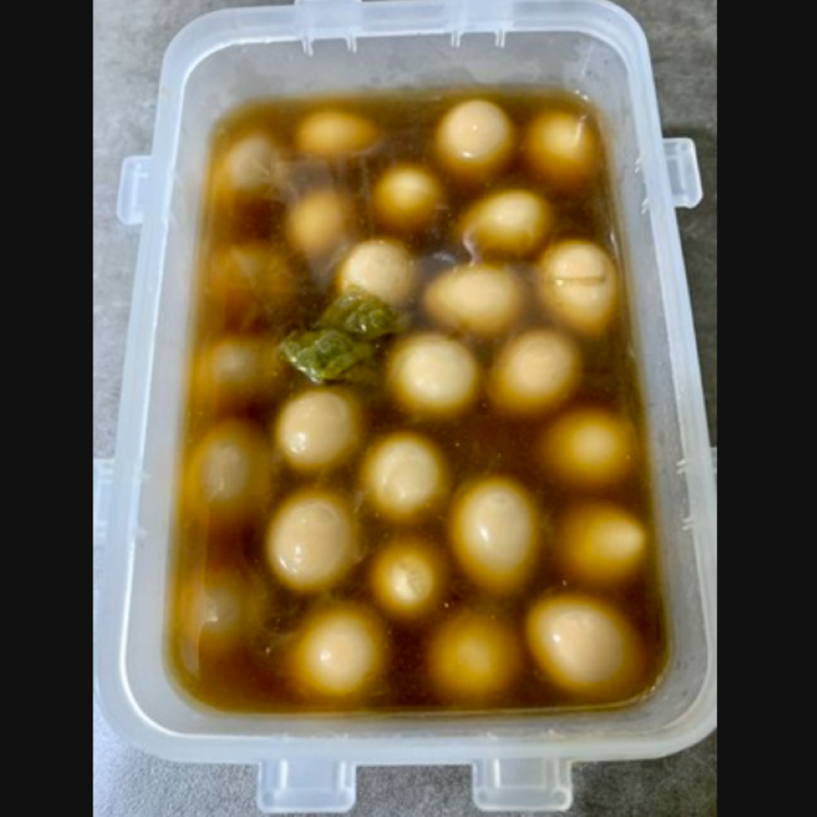 Quail eggs 55% (domestic), purified water, mixed soy sauce {defatted soybeans (imported from India), sea salt (imported from Australia), other fructose, wheat, alcohol}, white sugar, chili peppers (domestic), sauce